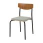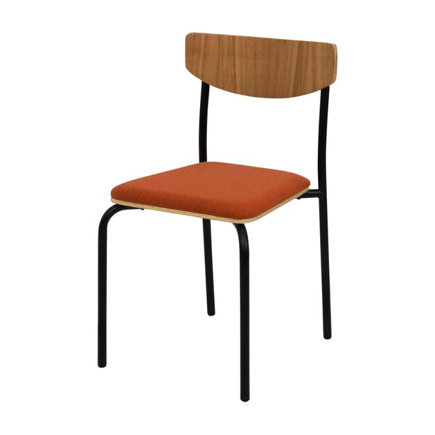 Cadeira com estrutura em tubo de aço com acabamento em pintura epóxi-pó e assento em compensado com espuma (D26) e tecido 100% poliéster. Possui encosto em multilaminado revestido com lâmina natural (Freijó) com aplicação de verniz.