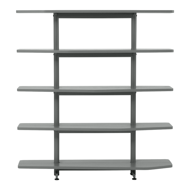 Estante com estrutura em tubo de aço com pintura epóxi-pó, prateleiras em MDF (Medium Density Fiberboard) de 30 mm e travessas em madeira maciça (Pinus Elliottii) com acabamento em pintura laqueada. Possui 5 prateleiras e sapatas plásticas reguláveis.