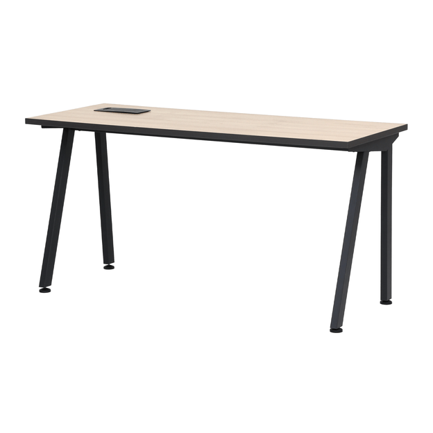 Mesa com pés e calha em tubo e chapa de aço com pintura epóxi-pó, e tampo em MDP de 25 mm revestido com laminado melamínico de baixa pressão e bordas em PVC. Possui caixa para conectividade com 8 entradas destacáveis, e sapatas plásticas reguláveis.