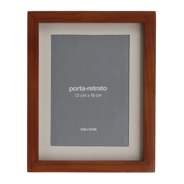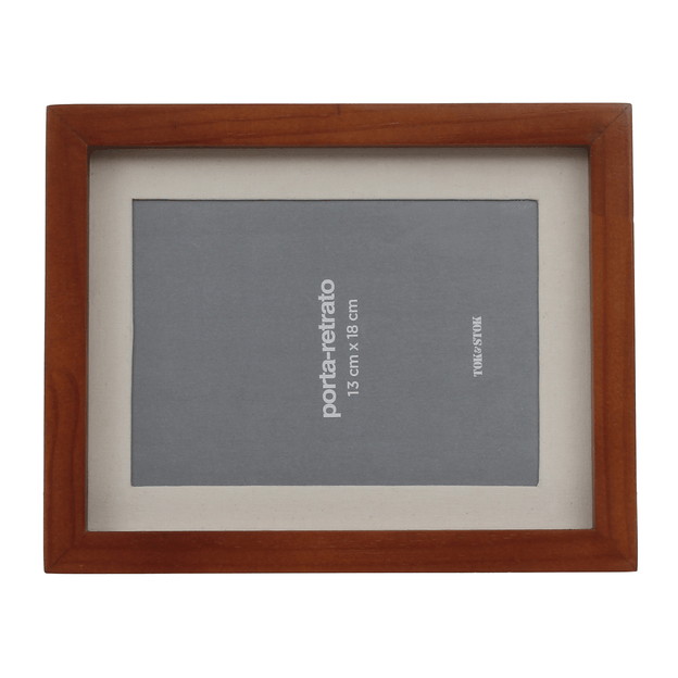Porta-retrato, para mesa, confeccionado em madeira maciça (Pinus Elliottii) com acabamento em verniz. Possui visor em vidro incolor e passe-partout revestido em tecido 100% algodão. Para uso com fotos, horizontais ou verticais, 13 cm x 18 cm.