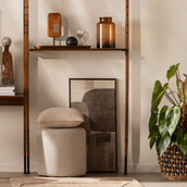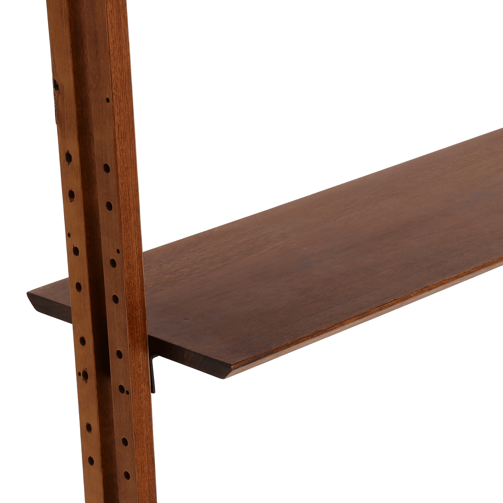 Estante/divisória, para parede e teto, em madeira maciça (Tauari) tingida com acabamento encerado e ferragens em chapa de aço com pintura epóxi-pó. Possui altura regulável, 4 prateleiras removíveis e reposicionáveis, sapatas plásticas reguláveis.Estante/escrivaninha, para parede e teto, em madeira maciça (Tauari) tingida com acabamento encerado e ferragens em chapa de aço com pintura epóxi-pó. Possui altura regulável, 2 prateleiras removíveis e reposicionáveis e 1 tampo de apoio.