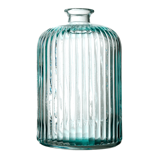 Vaso, confeccionado artesanalmente em vidro reciclado soprado. Possui detalhes em relevo.