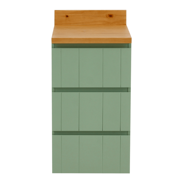 Gaveteiro, suspenso, com caixaria em MDF de 15 mm com acabamento em pintura por impressão. Possui 3 gavetas com corrediças telescópicas, detalhes em baixo-relevo e pintura laqueada.Tampo em madeira maciça de reflorestamento (Pinus Elliottii) de 30 mm, com frontão de 18 mm, tingida com aplicação de verniz poliuretano. Para o uso com módulos inferiores da mesma linha (vendidos separadamente).