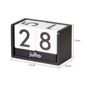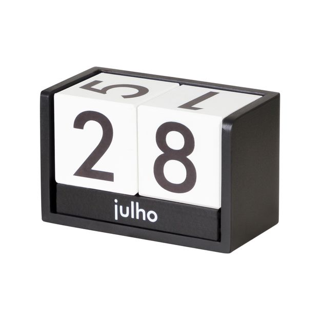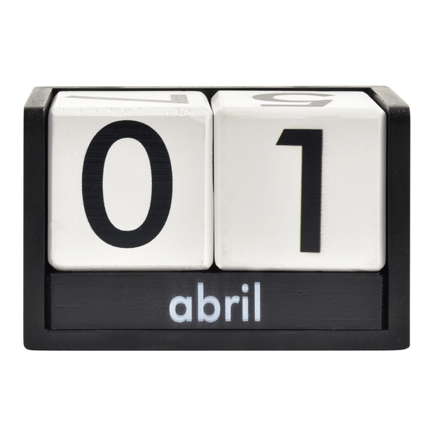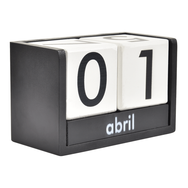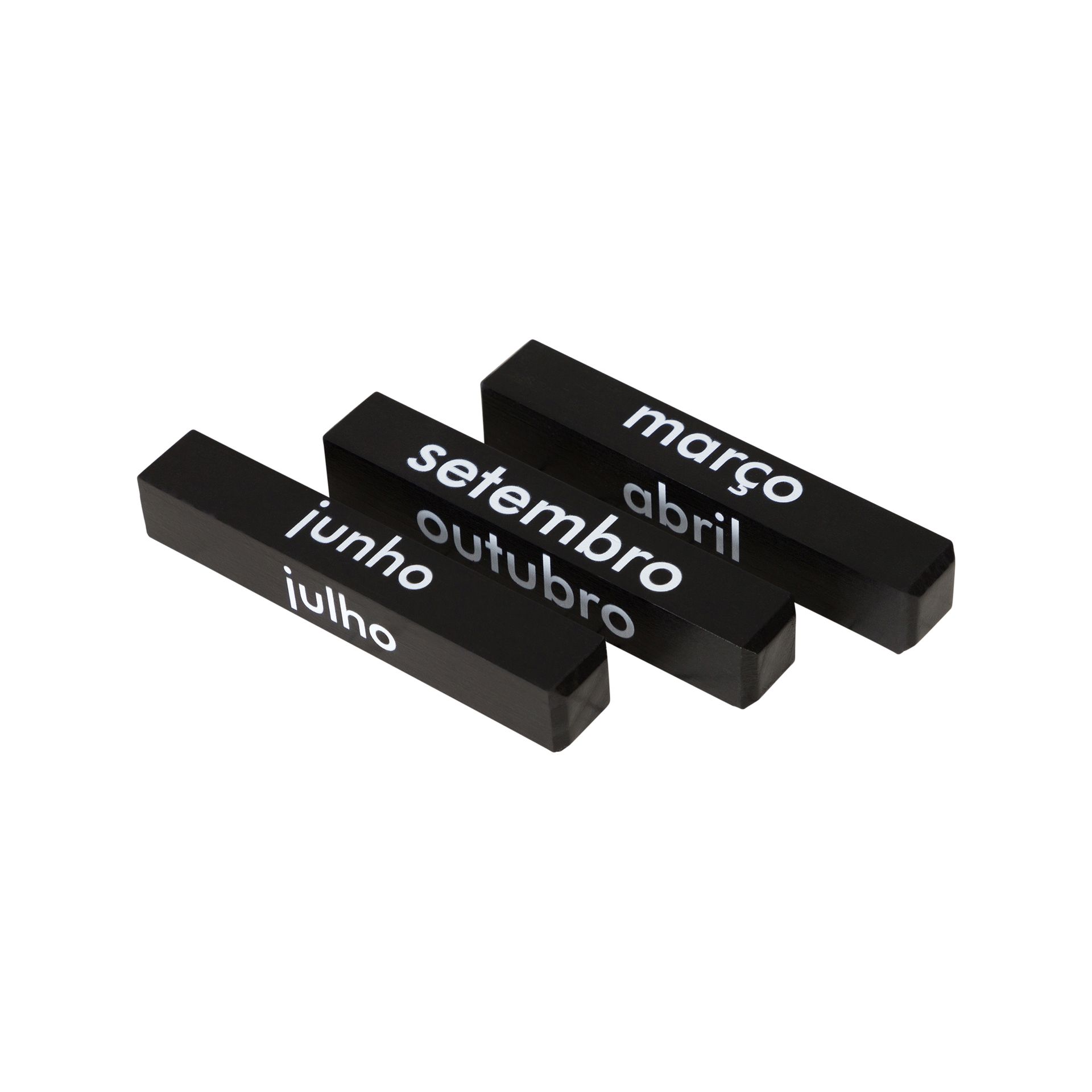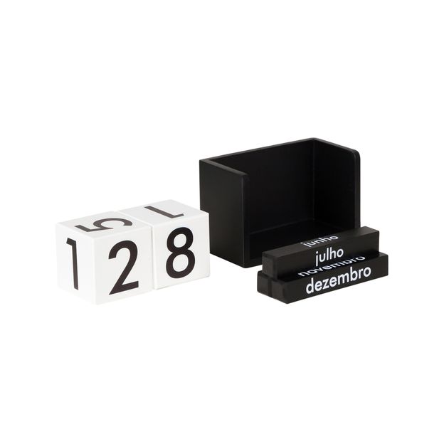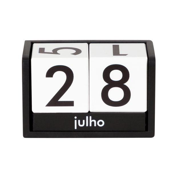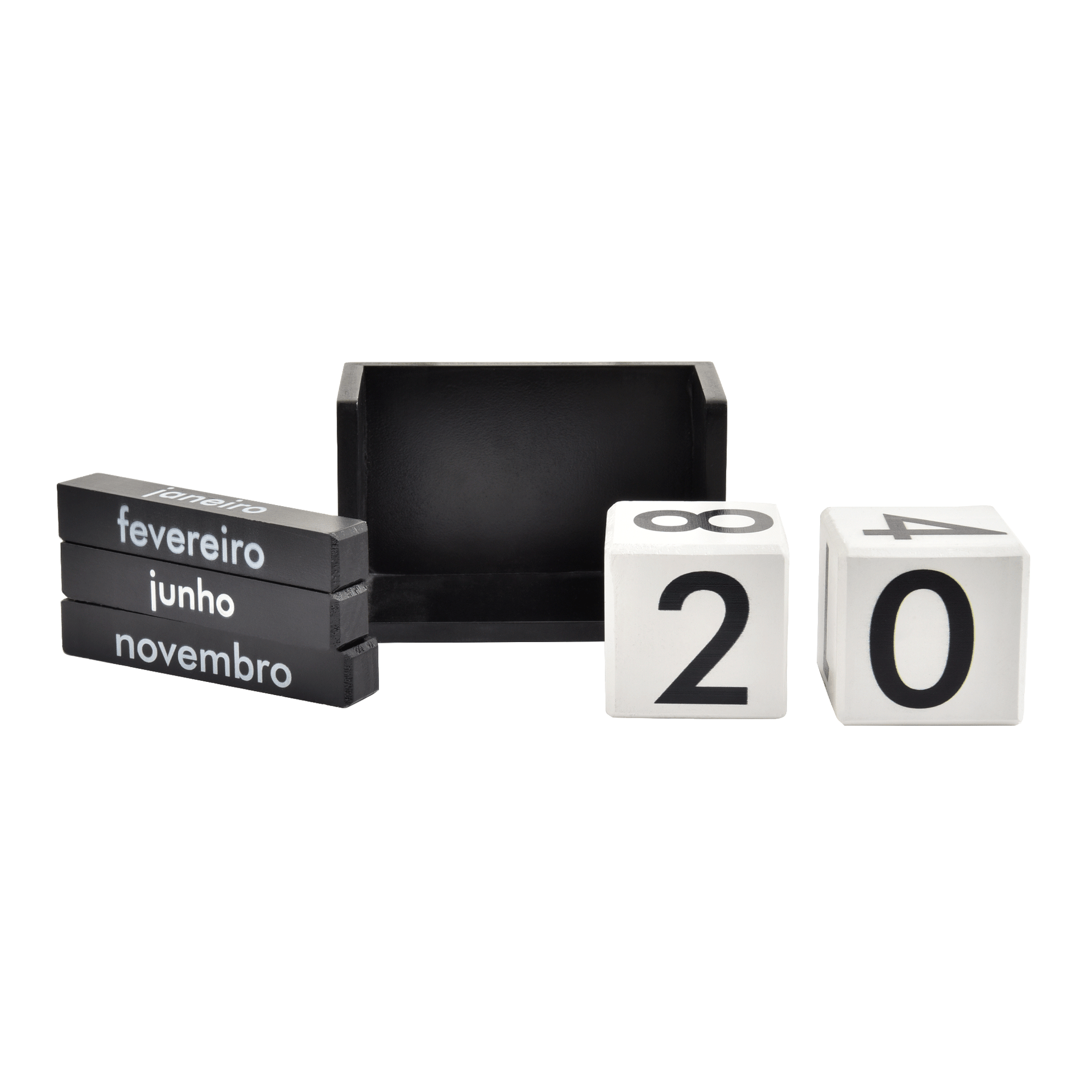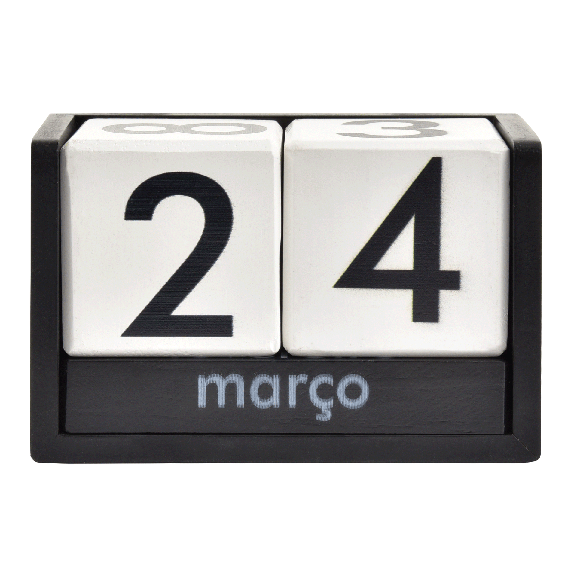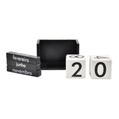 Calendário permanente em MDF (Medium Density Fiberboard) com aplicação de estampa em silkscreen.
