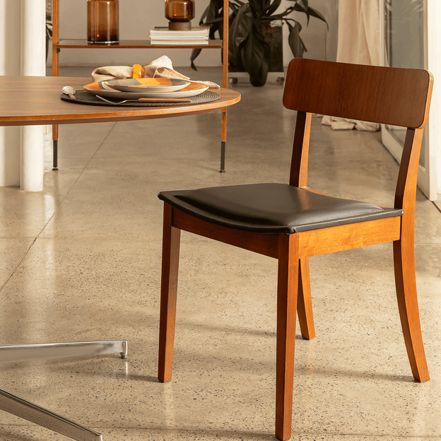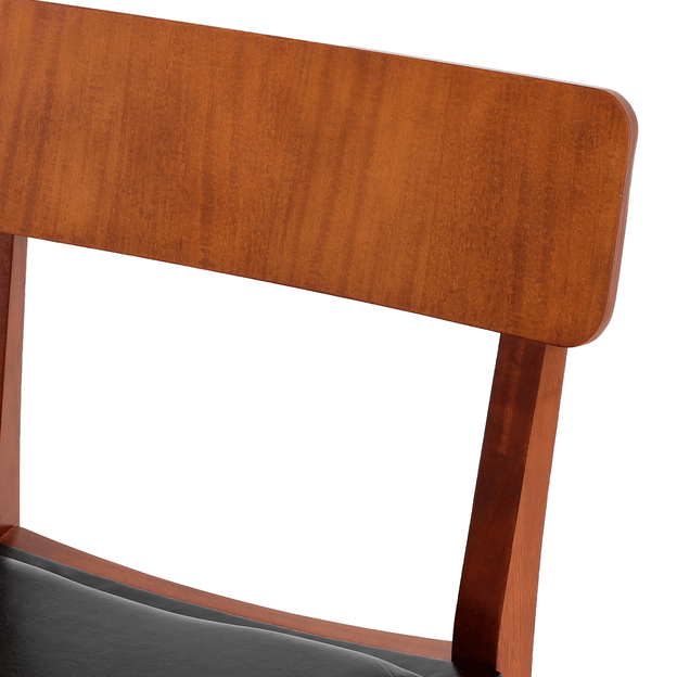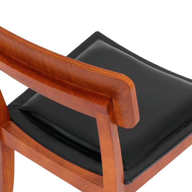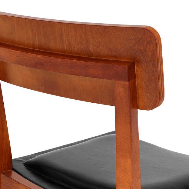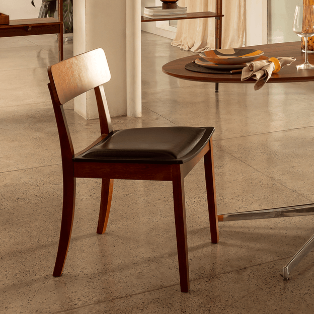Cadeira com estrutura em madeira maciça (Eucalipto) e encosto em compensado revestido com lâmina natural (Embuia), tingidos, com acabamento em verniz poliuretano. Possui assento em espuma (D28) e revestimento sintético em PVC.