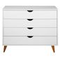 Cômoda em MDP de 15 mm revestido com laminado melamínico baixa pressão com bordas em PVC. Possui 4 gavetas com corrediças metálicas e pés em madeira maciça de reflorestamento (Eucalipto) tingida. Dispensa puxadores.