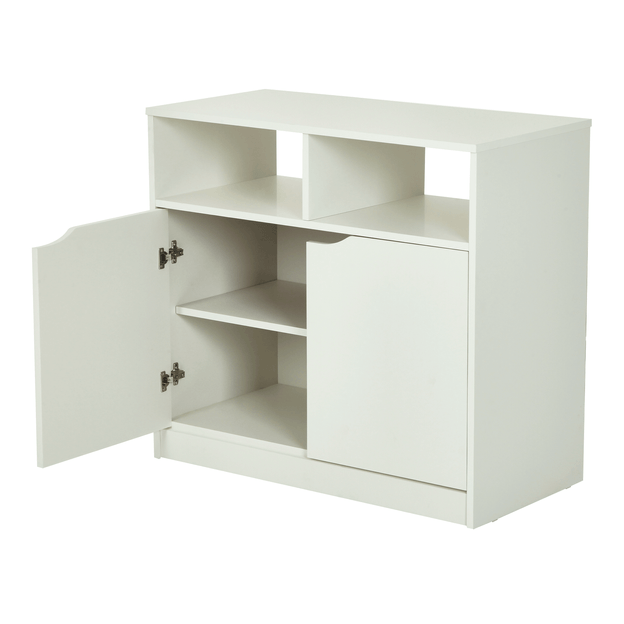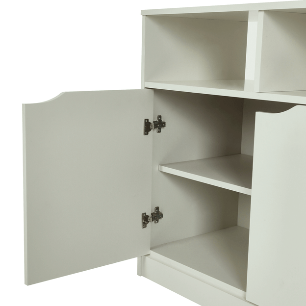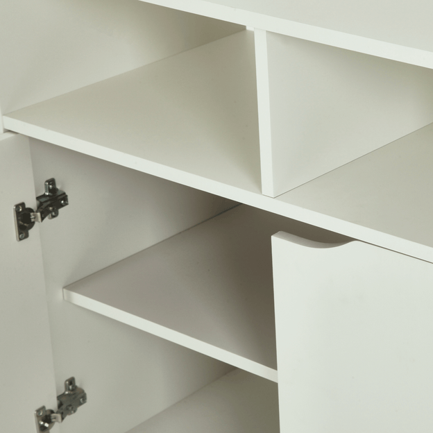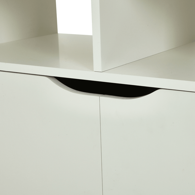 Armário em MDF (Medium Density Fiberboard) com acabamento em pintura por impressão. Possui 4 nichos, sendo 2 internos com prateleira móvel, e sapatas plásticas.