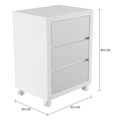 Mesa de cabeceira com estrutura em aglomerado e MDF (Medium Density Fiberboard) com acabamento em pintura. Possui 3 gavetas espelhadas com corrediças telescópicas e rodízios plásticos, sem travas.