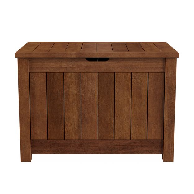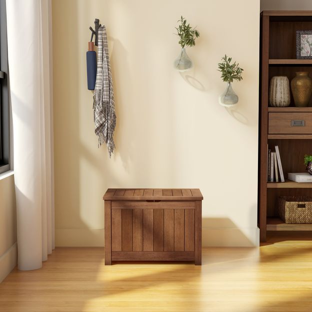Banco/baú, em madeira maciça de reflorestamento (Eucalipto) com acabamento em tingidor impermeabilizante, tipo stain, com ação inseticida e fungicida. Possui tampa com sistema articulado de abertura.