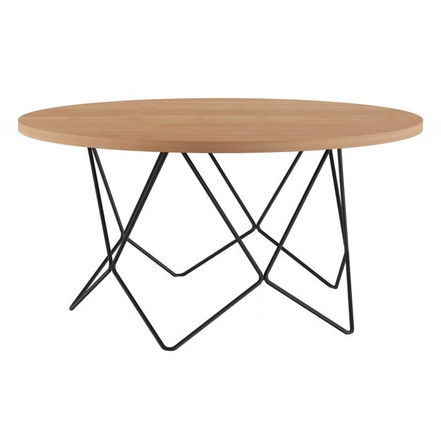 Mesa de centro com base em arame de aço maciço com acabamento em pintura epóxi-pó e tampo em MDF (Medium Density Fiberboard) de 20 mm revestido com lâmina natural (Tauari) com selador e aplicação de verniz.