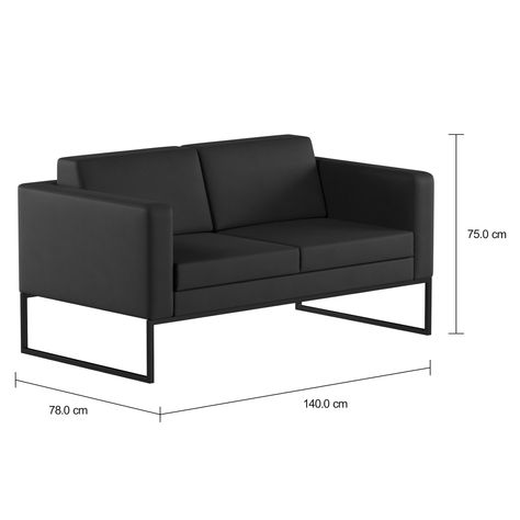 Sofá com estrutura em madeira maciça (Pinho), percintas elásticas, espuma de poliuretano (D35/assento e D26/encosto) e revestimento sintético em PVC. Possui pés em tubo de aço com acabamento em pintura epóxi-pó preto e sapatas em silicone.