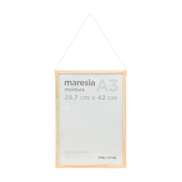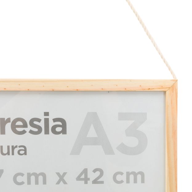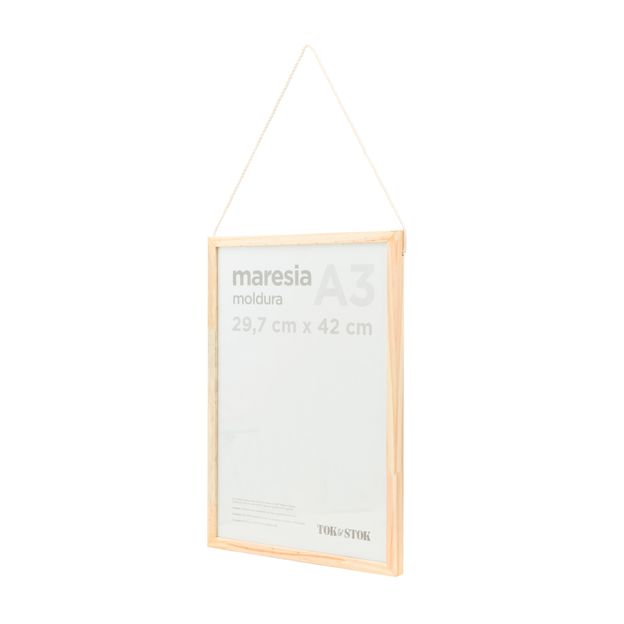 Kit para emoldurar fotos, desenhos ou gravuras, com vidro e moldura em madeira maciça (Pinus Elliottii). Possui alça em barbante 100% algodão para que possa ser pendurado. Pode ser usado com imagens de tamanho A3, 29 cm x 42 cm; na vertical.