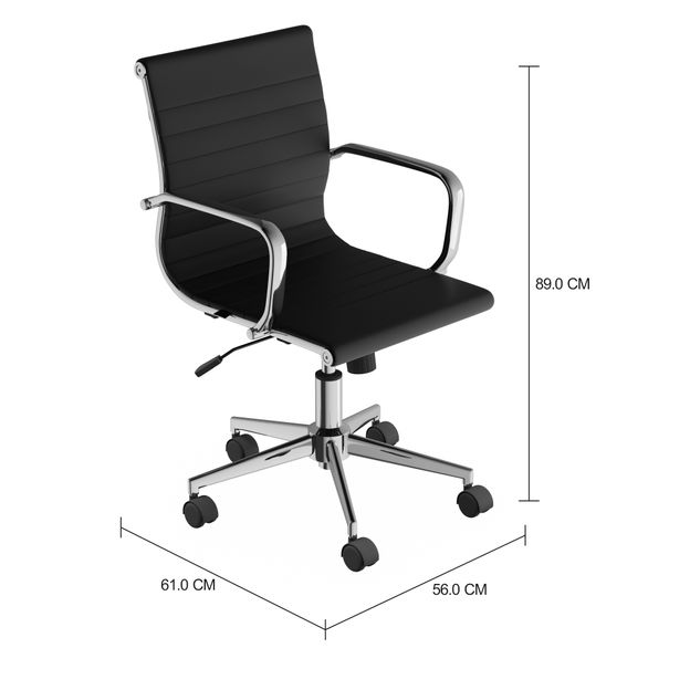 Cadeira giratória, com base e braços em tubo de aço cromado e assento/encosto com espuma e revestimento sintético poliuretano, com densidade D20. Possui regulagem de altura a gás com pistão classe 2, função relax no assento/encosto e rodízios em nylon.