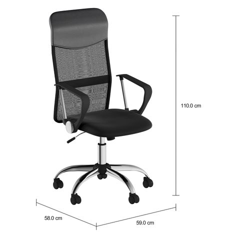 Cadeira giratória, com base em tubo de aço cromado e assento em compensado multilaminado revestido com espuma (D24) e tecido 100% poliéster. Possui encosto em tela sintética, regulagem de altura a gás e função relax no assento/encosto.