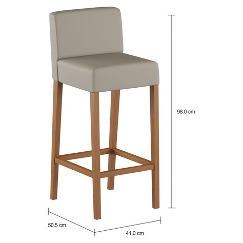 Banco alto, com estrutura em madeira maciça (Tauari) tingida com aplicação de verniz poliuretano. Possui assento e encosto em compensado multilaminado com espuma (D26/assento e D20/encosto) e revestimento sintético poliuretano.
