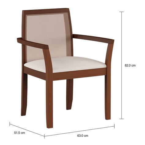 Cadeira com braços, com estrutura em madeira maciça (Tauari) tingida com acabamento em verniz. Possui assento em MDF revestido com espuma (D23) e tecido 100% poliéster, tipo suede, e encosto em tela de fibra sintética trançada.