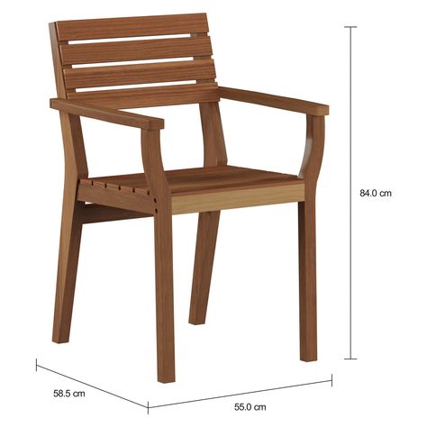 Cadeira com braços, em madeira maciça (Teca) com acabamento tingidor impermeabilizante, tipo stain, à base de água com ação inseticida e fungicida.