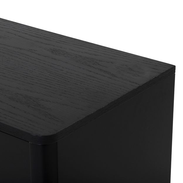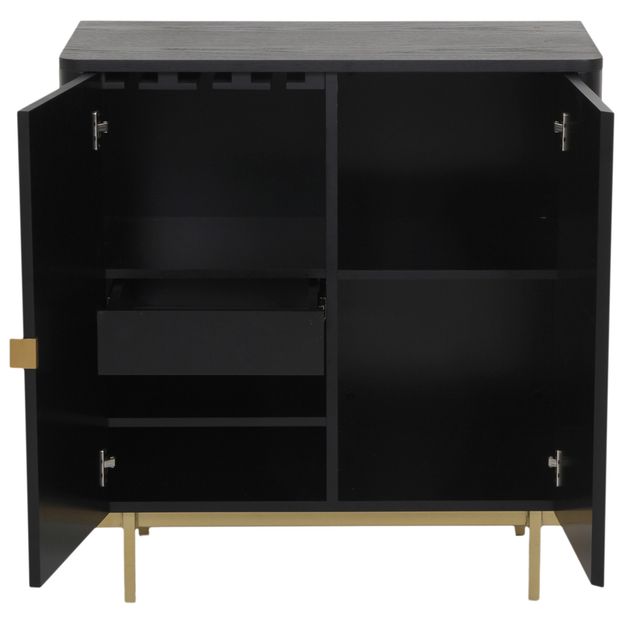 Buffet/bar em MDP com lâmina natural (Carvalho) tingida e com acabamento em pintura. Possui 2 portas, 5 nichos, sendo 2 prateleiras reguláveis, 1 gaveta com corrediças telescópicas, porta-taças e pés em tubo de aço pintado.