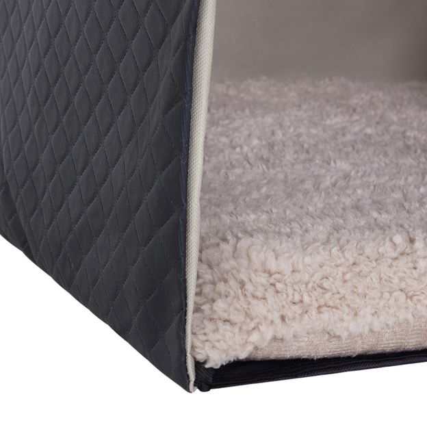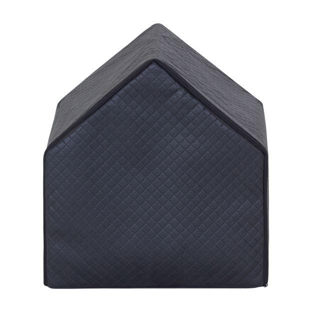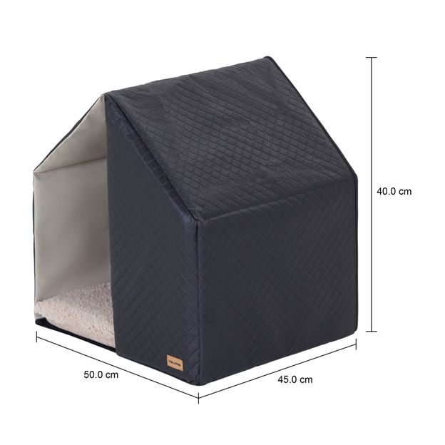 Casinha para pet, em nylon 600 100% poliéster e PVC (Policloreto de Vinila) com estrutura em MDF (Medium Density Fiberboard). Acompanha almofada em suede e pelúcia 100% poliéster com enchimento em espuma. Possui zíper.