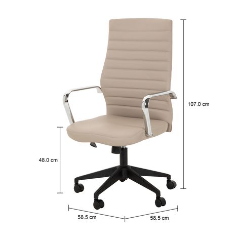 Cadeira giratória, com base em nylon e assento/encosto em multilaminado com espuma (D60) e revestimento sintético poliuretano. Possui regulagem de altura a gás, função relax no assento/encosto e rodízios em poliuretano.