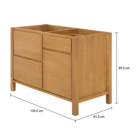 Armário inferior em madeira maciça de reflorestamento (Pinus Elliottii) tingida e escovada com aplicação de verniz. Possui 2 portas, sendo 1 basculante, e 2 gavetas com corrediças telescópicas.