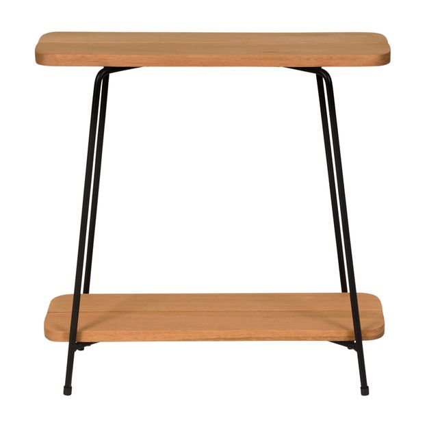 Mesa lateral/floreira com estrutura em tubo de aço com acabamento em pintura epóxi-pó. Possui 2 prateleiras em madeira maciça de reflorestamento (Eucalipto) de 20 mm com tingidor impermeabilizante, tipo stain, com ação inseticida e fungicida.