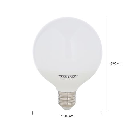Lâmpada com iluminação por LED, modelo globo, luz amarela, com potência de 9,5 Watts, 127/220 Volts e rosca E27. Sua potência equivale à de uma lâmpada incandescente de aproximadamente 100 Watts. Possui vida útil de até 15.000h.