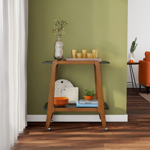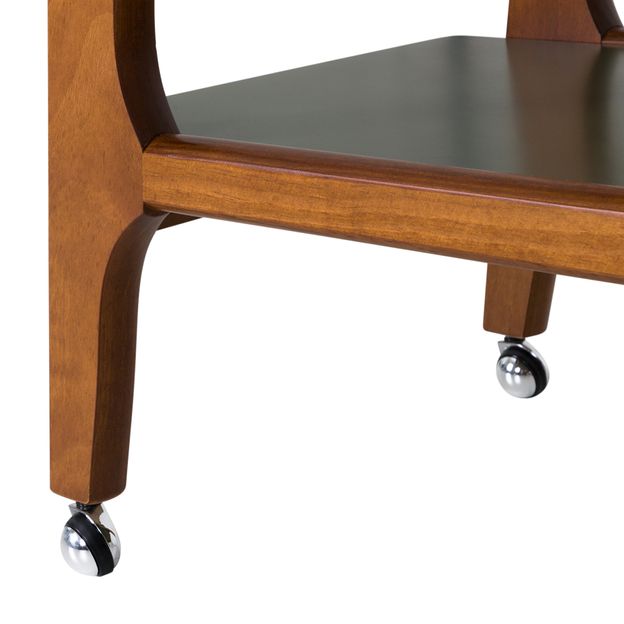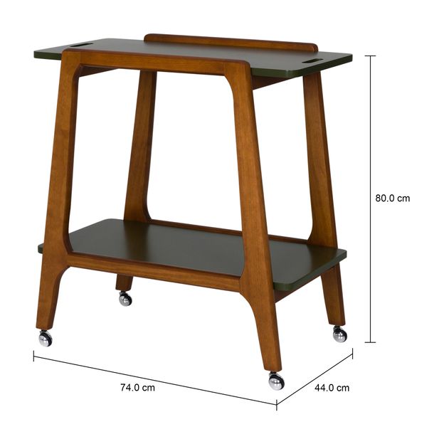 Carrinho com estrutura em madeira maciça de reflorestamento (Pinus Elliottii) tingida com aplicação de verniz, com tampo e prateleira em MDF (Medium Density Fiberboard) de 18 mm com acabamento em pintura poliuretânica. Possui rodízios plásticos.