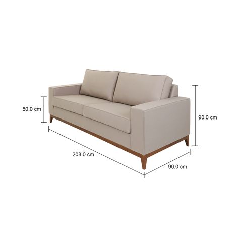 Sofá com estrutura em madeira maciça (Eucalipto), percintas elásticas com espuma (D28/braço) e tecido 100% poliéster. Acompanha 4 almofadas, sendo 2 para o encosto e 2 para o assento.