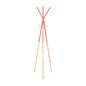 Cabide de piso, em madeira maciça de reflorestamento (Pinus Elliottii) tingida com aplicação de verniz. Possui 3 hastes e 3 ganchos em tubo de aço com acabamento em pintura epóxi-pó.