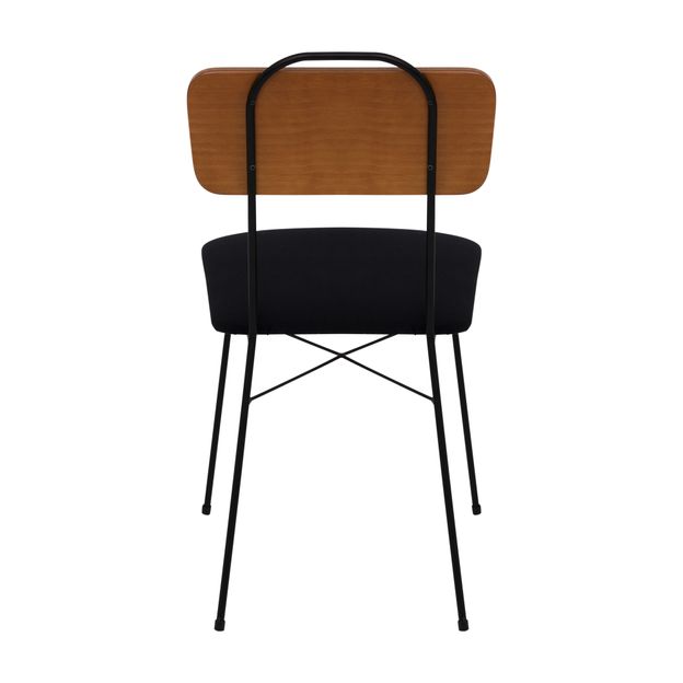 Cadeira com estrutura em tubo de aço com acabamento em pintura epóxi-pó, e assento em MDF revestido com espuma (D26) e tecido 82% algodão/18% poliéster. Possui encosto em compensado com lâmina de madeira (Pinus Elliottii) tingida com aplicação de verniz.