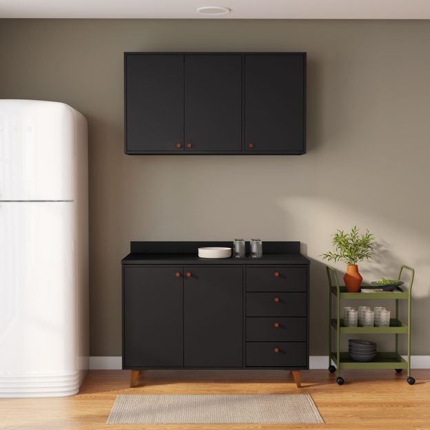 Armário superior em MDP de 15 mm revestido com laminado melamínico baixa pressão com bordas em PVC. Possui 3 portas, 4 nichos e puxadores em madeira maciça de reflorestamento (Eucalipto) tingida.