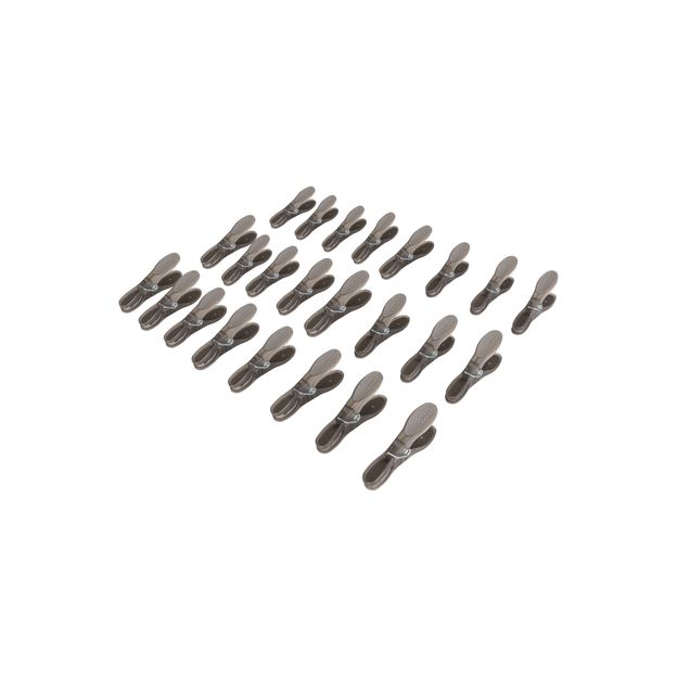 Conjunto com 24 prendedores em plástico com mecanismo em metal.