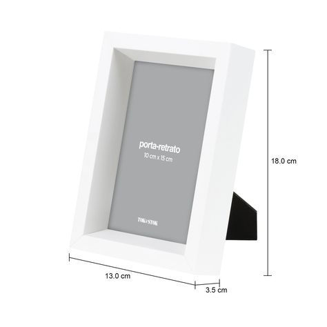 Porta-retrato, para mesa, em madeira maciça (Pinus Elliottii) com acabamento em pintura e visor em vidro incolor. Pode ser usado na horizontal ou vertical e comporta fotos de até 10 cm x 15 cm.