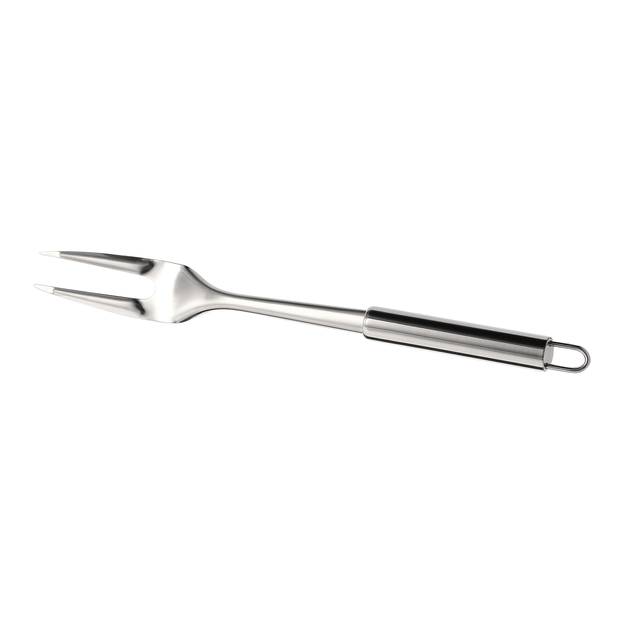 Garfo, em aço inoxidável. Possui alça para ser pendurado.