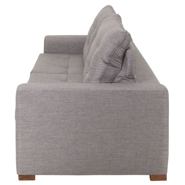 Sofá com estrutura em madeira maciça (Eucalipto), percintas elásticas, molas, espuma de poliuretano (D26/assento e D23/braços), manta acrílica e tecido 100% poliéster. Possui assento extensível/retrátil, pés maciços e rodízios plásticos.