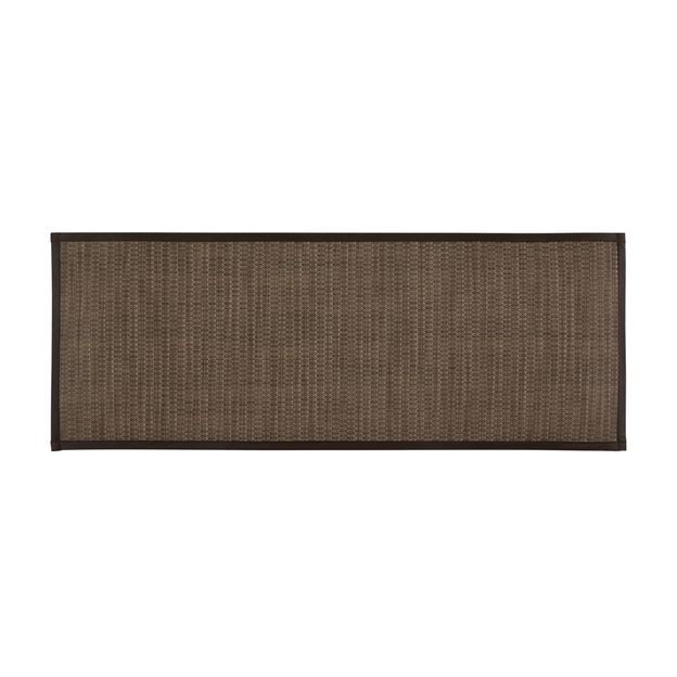 Tapete, com superfície, 72% policloreto de vinila (PVC)/ 28% poliéster. Possui base emborrachada.