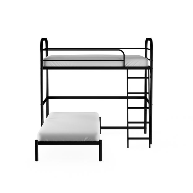 Cama de solteiro em tubo de aço carbono com acabamento em pintura epóxi-pó e estrado em madeira maciça de reflorestamento (Pinus Elliottii e Cedro Marinheiro). Possui sapatas em polipropileno.Sistema de quarto integrado, em tubo de aço com acabamento em pintura epóxi-pó. Possui estrado em MDP (Medium Density Particleboard) e escada com 5 degraus.