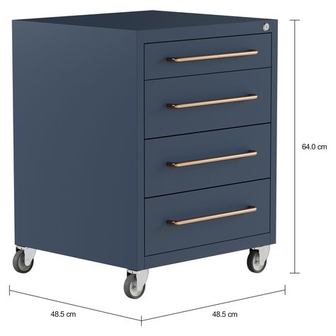 Gaveteiro, com chave, em chapa de aço com acabamento em pintura epóxi-pó. Possui 4 gavetas e rodízios em nylon sem travas.Puxador, para furação 256 mm, em tubo de aço com acabamento em banho de cobre.