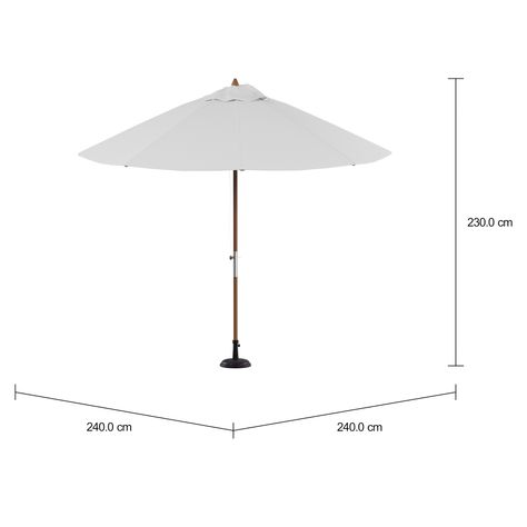 Base para ombrelone com estrutura em concreto com acabamento em resina e haste em polipropileno. Possui manípulo para travamento e adaptadores com 3 opções de regulagem do diâmetro (3 cm, 4 cm e 4,8 cm).Ombrelone redondo (8 gomos) com armação e haste (Ø4,2cm) em madeira maciça (Garapeira) com acabamento tingidor impermeabilizante, tipo stain, com ação inseticida e fungicida, revestido em bagum com tela de algodão na face interna.