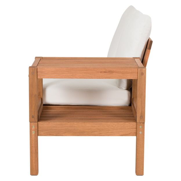 Conjunto de almofadas composta por: 1 para o assento com enchimento em espuma (D20) e 2 para o encosto com enchimento em fibra siliconizada, revestidas em tecido 'aquatec' 68% algodão/32% poliéster com tratamento hidrorrepelente.Estrutura de sofá em madeira maciça de reflorestamento (Eucalipto) com acabamento em tingidor impermeabilizante, tipo stain, com ação inseticida e fungicida. Possui mesa lateral reposicionável.