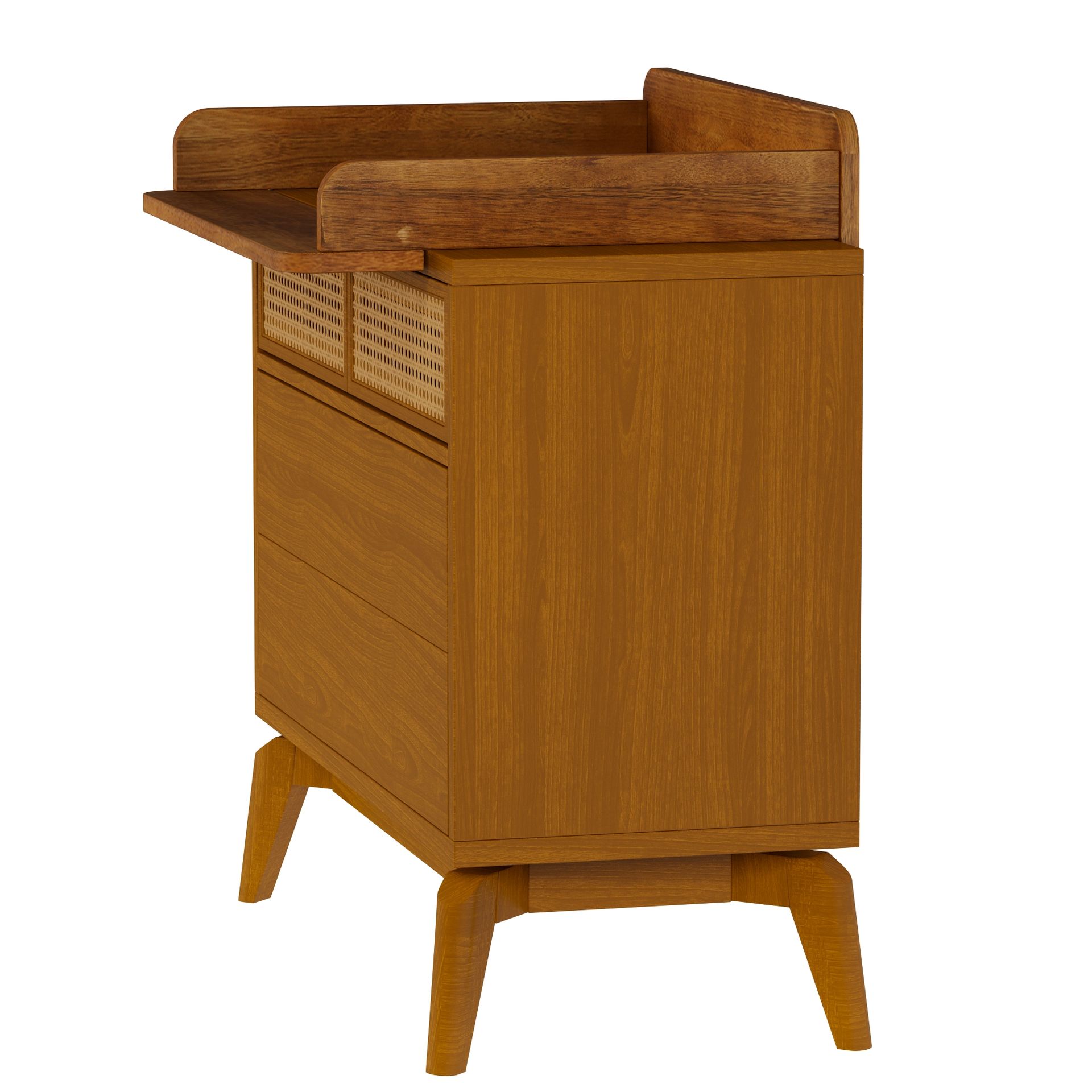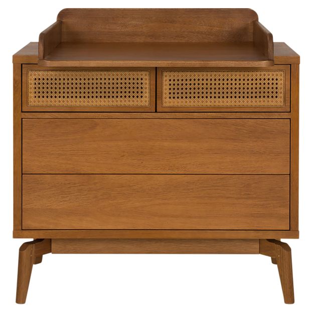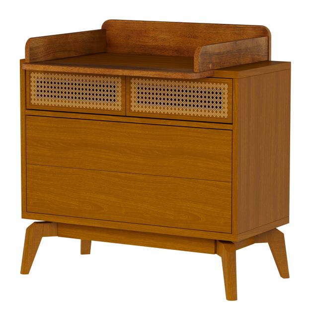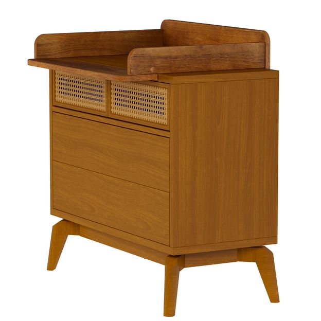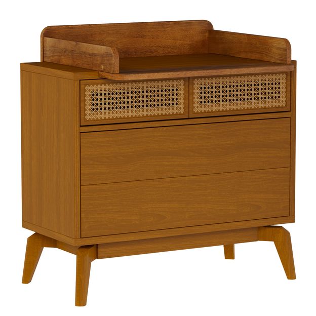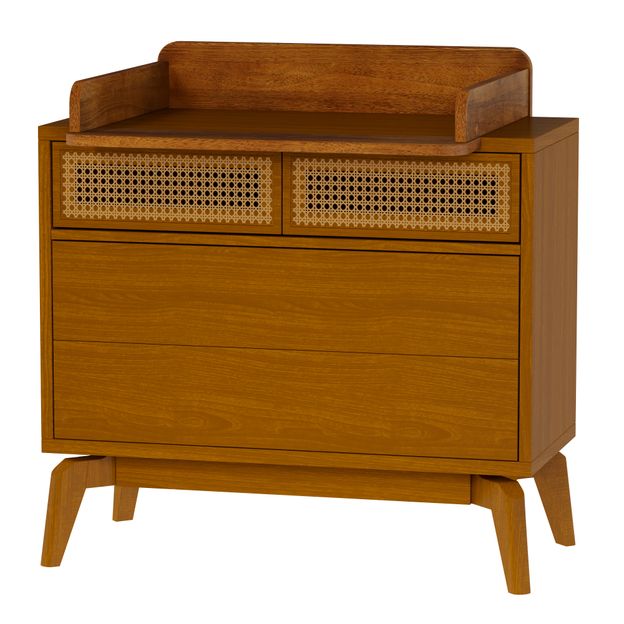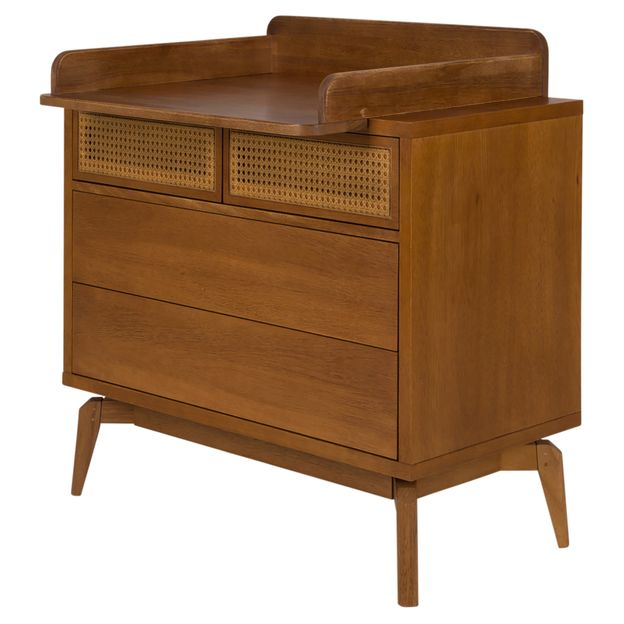 Cômoda em madeira maciça (Tauari) e MDP revestido com lâmina natural (Tauari) tingida com aplicação de verniz poliuretano. Possui 4 gavetas, sendo as 2 menores com frentes em fibra natural trançada, corrediças telescópicas e abertura por fecho-toque.Estrutura de trocador em madeira maciça (Tauari) e MDP revestido com lâmina natural (Tauari) tingida com aplicação de verniz poliuretano. Para uso acoplado na cômoda da mesma linha (vendida separadamente).