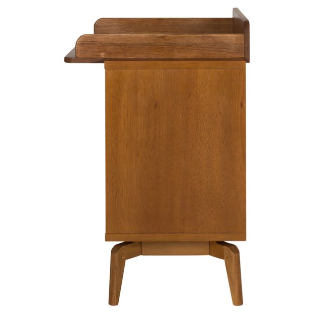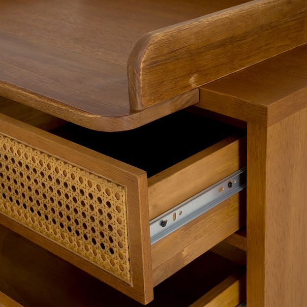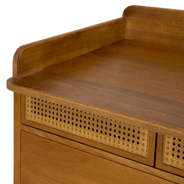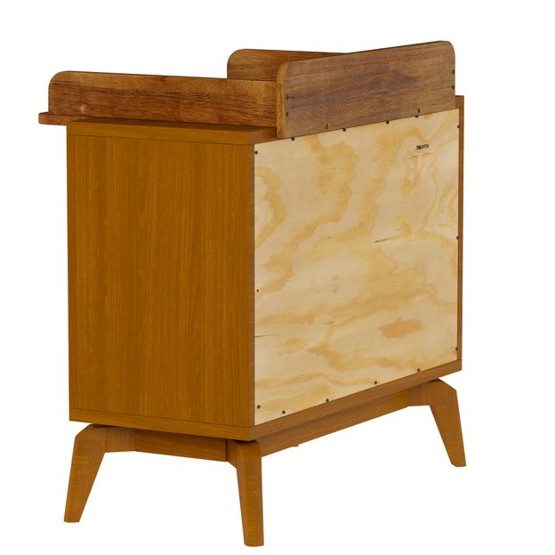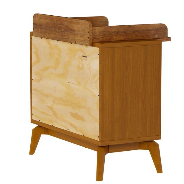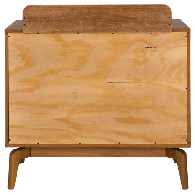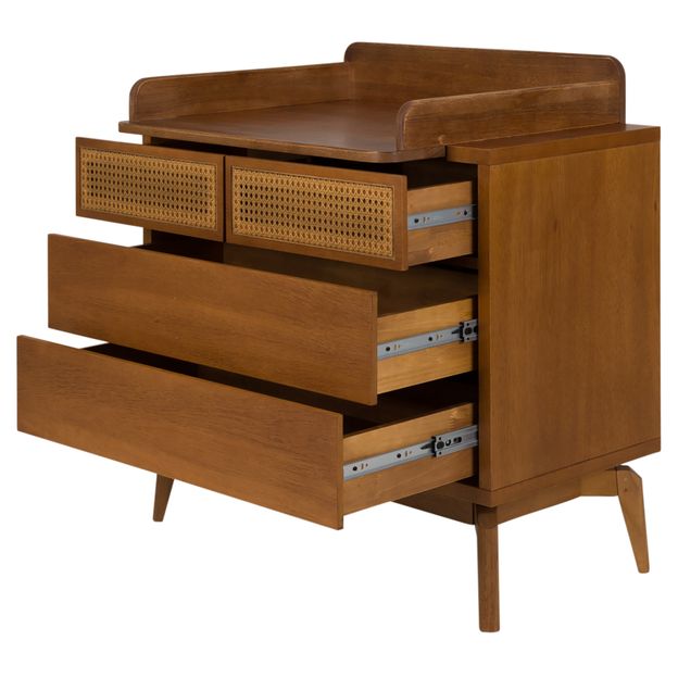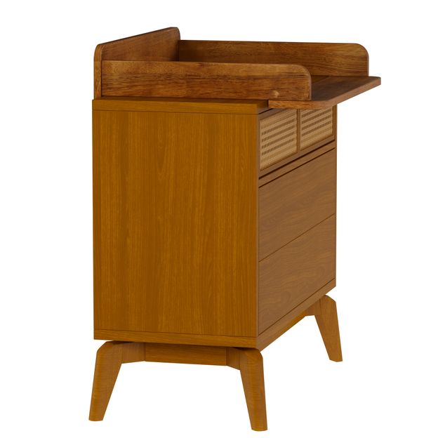 Cômoda em madeira maciça (Tauari) e MDP revestido com lâmina natural (Tauari) tingida com aplicação de verniz poliuretano. Possui 4 gavetas, sendo as 2 menores com frentes em fibra natural trançada, corrediças telescópicas e abertura por fecho-toque.Estrutura de trocador em madeira maciça (Tauari) e MDP revestido com lâmina natural (Tauari) tingida com aplicação de verniz poliuretano. Para uso acoplado na cômoda da mesma linha (vendida separadamente).
