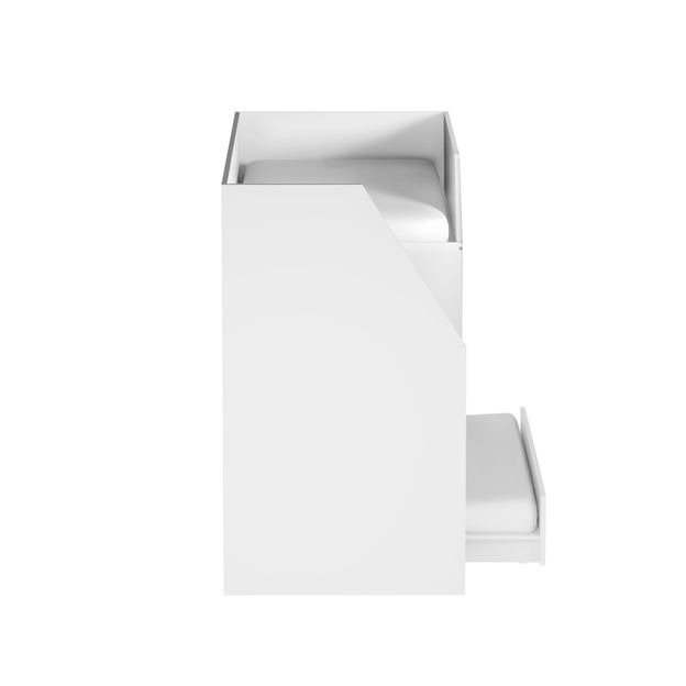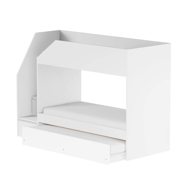 Beliche em MDP de 15 mm e 18 mm revestidos com laminado melamínico de baixa pressão e bordas em PVC. Possui escada lateral com 3 degraus (2 que permitem o uso como baú e 1 como gavetão inferior) e estrados em madeira maciça (Pinus Elliottii).Cama inferior, em MDF (Medium Density Fiberboard) revestido com laminado melamínico de baixa pressão e bordas em PVC. Possui estrado em compensado multilaminado e rodízios em nylon, sem trava.