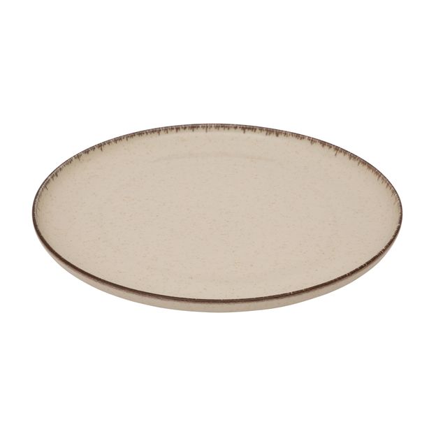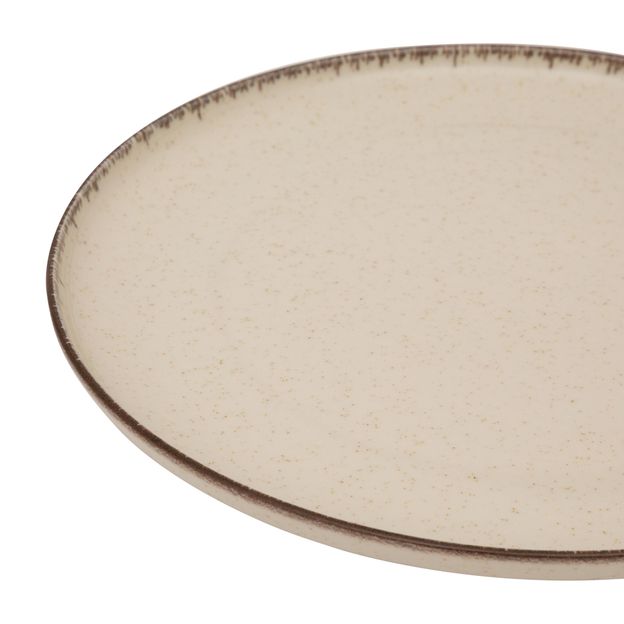 Prato raso, em porcelana esmaltada. Possui detalhe com efeito desgastado na borda.