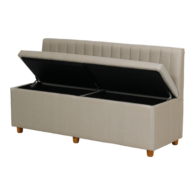A linha de canto alemão Platz pode ser uma ótima solução para compor pequenos espaços como studios e apartamentos de plantas compactas. Assinado com exclusividade pelo designer Hakim Hazim e disponível em uma cartela de cores atuais, este canto alemão possui estrutura em madeira maciça de reflorestamento Eucalipto, percintas elásticas e espuma de poliuretano D23; matérias-primas que garantem resistência e durabilidade ideais para o dia a dia. Além disso, conta com encosto que se encaixa ao corpo proporcionando maior conforto e comodidade ao sentar-se. Modular, permite criar combinações com os demais módulos da mesma linha (vendidos separadamente) de acordo com a sua escolha e necessidade. Já o baú permite armazenar objetos variados de maneira prática. Vale lembrar que seu sistema de abertura e fechamento basculante facilita o manuseio do produto com segurança. Observação: Medidas totais da frente e profundidade do assento: 1,52 m x 44 cm. Medidas internas do baú: 32 cm x 72 cm x 39 cm (cada divisória). Os pés são fornecidos desmontados; vide manual de montagem.