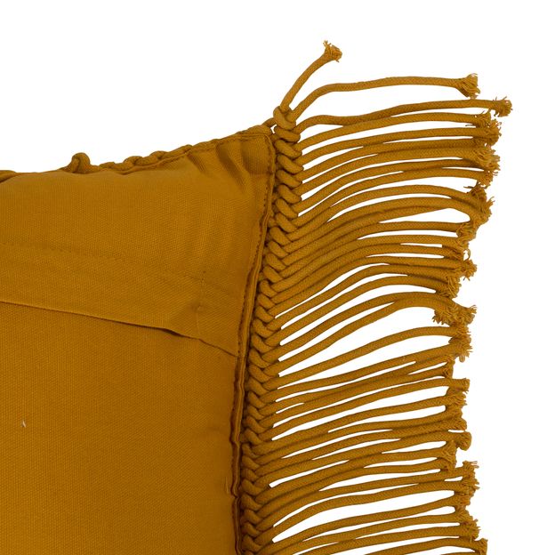 Almofada em tecido 100% algodão com aplicação de tramas em macramê na frente e verso liso. Possui enchimento em fibra 100% poliéster e fechamento por zíper invisível.