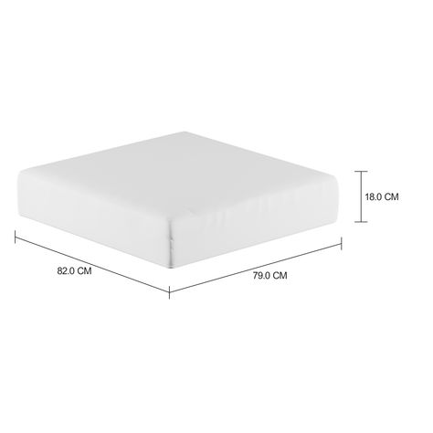Almofada com enchimento em manta acrílica siliconizada e espuma (D20), revestida com tecido 68% algodão/32% poliéster (face superior) e bagum (face inferior) com tratamento hidrorrepelente. Capa não removível.