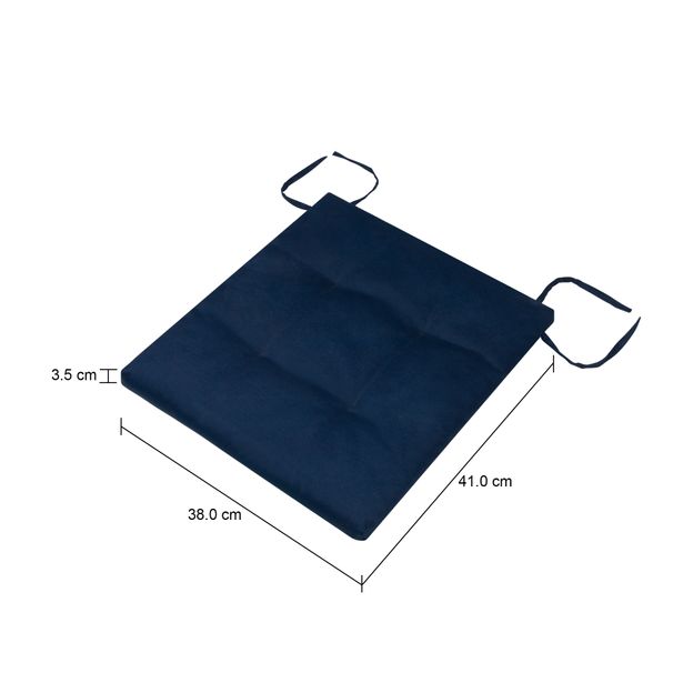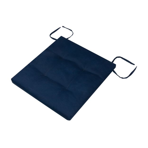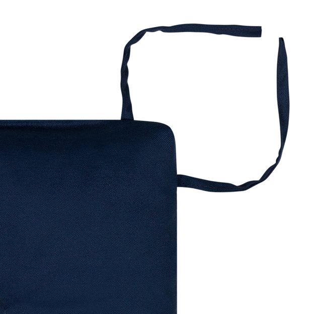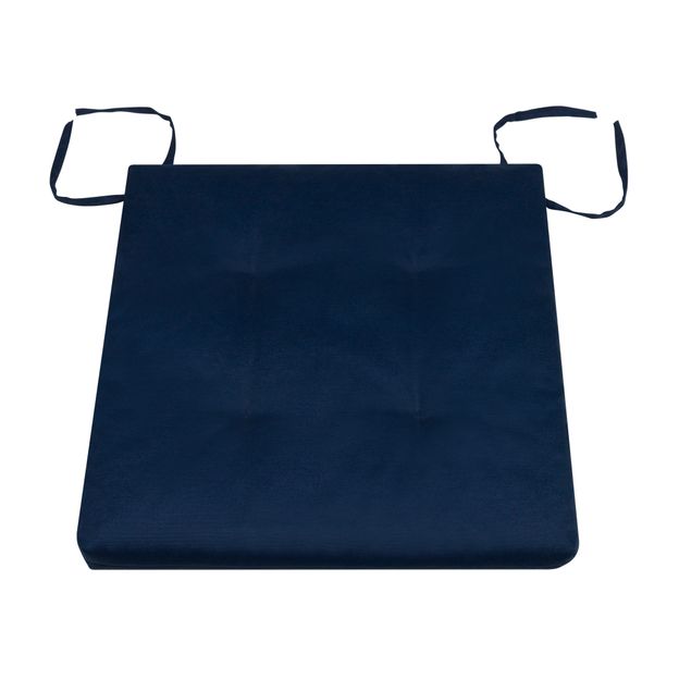 Almofada com enchimento em manta acrílica siliconizada e espuma (D20), revestida com tecido 100% poliéster com tratamento hidrorrepelente. Possui fitas para fixação e detalhes em capitonês.