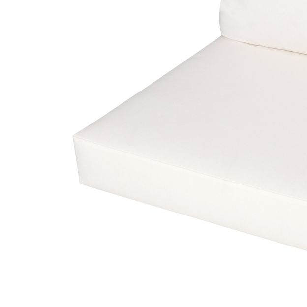 Conjunto de almofadas composta por: 1 para o assento com enchimento em espuma (D20) e 2 para o encosto com enchimento em fibra siliconizada, revestidas em tecido 'aquatec' 68% algodão/32% poliéster com tratamento hidrorrepelente.